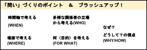 ⑥問いづくりについて説明:5W1Hの問い、YES/NOで答える問い